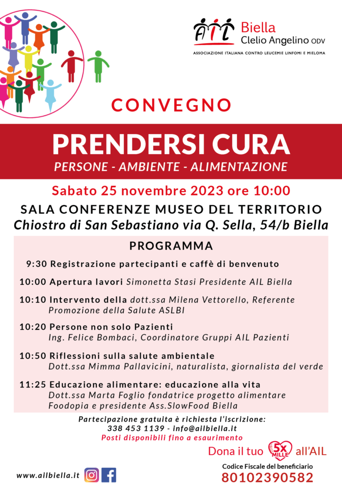 Sono aperte le iscrizioni al Convegno “Prendersi cura – Persone, Ambiente, Alimentazione” , daremo voce ai Pazienti e rifletteremo insieme su salute ambientale e alimentare, temi attuali, urgenti, che ci riguardano tutti.